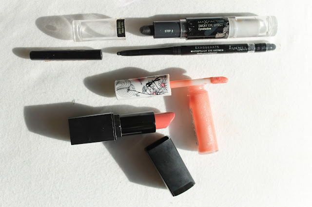Top to bottom: Max Factor Smokey Eye Effect, Rimmel Exaggerate Waterproof Eye Definer in Noir, Maybeline (MNY) Lipgloss in a peachy pink colour - the name has rubbed off.., ELF Lipstick in Party Pink.